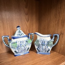 Ceramic Blue White Green Creamer Sugar Bowl Set Pictorial Pattern with Lid