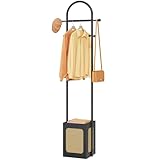 Coat Rack Stand with Wooden Base, Coat Tree Rattan Design, Coat Hanger Stand with 6 Hooks, Small Clothes Rack for Living Room, Bedroom, Office, Black